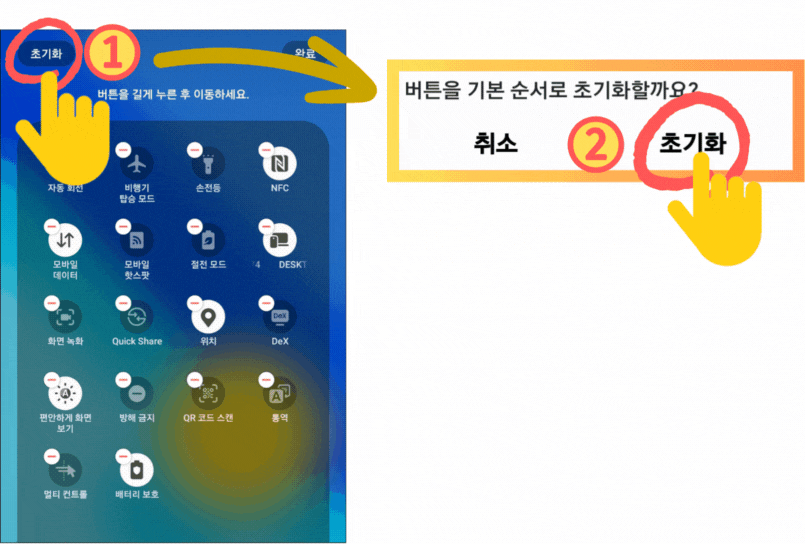 - 빠른 설정창 편집 화면에서 '초기화' 버튼을 클릭한 후 나타나는 팝업창에서 '초기화'를 누릅니다.