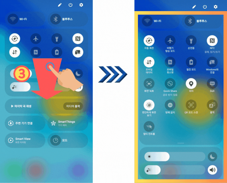 2) 빠른 설정창이 나타나면 한번 더 아래로 드래그하면 전체 빠른 설정창이 나타납니다.