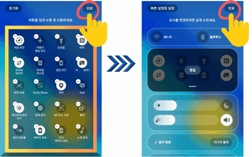 4) 원하는 대로 정리할 후, 완료 버튼을 누른 후 '빠른 설정창 설정' 화면에서 '완료' 버튼을 누릅니다.