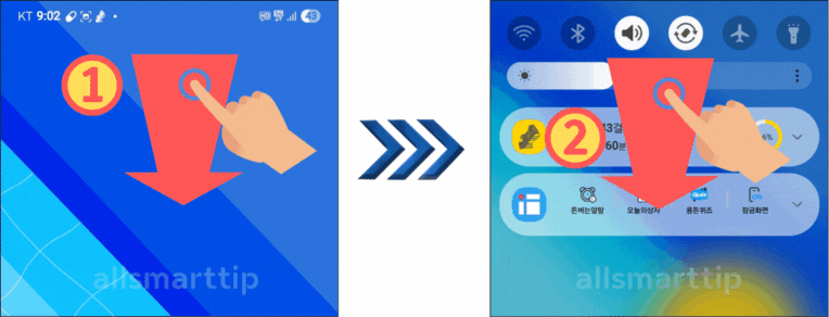 ☞ 한 번 내리면 '알림 + 요약 설정창', 두 번 내리면 '빠른 설정창'이 보여지는 구조예요.